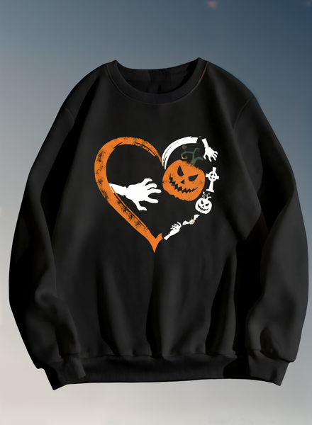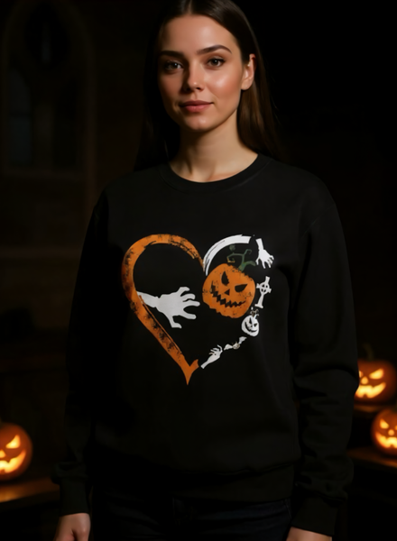 Celebrate the spirit of Halloween with this cozy Round Neck Sweatshirt featuring a charming heart-shaped pumpkin design. Perfect for adding festive warmth and style to your fall wardrobe.