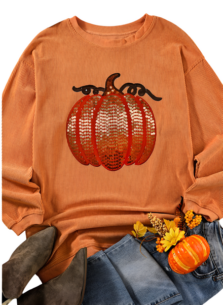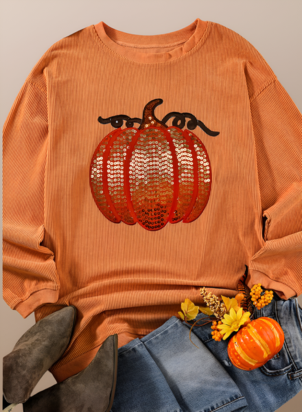 Embrace the spirit of the season with this Halloween Sequined Pumpkin Ribbed Round Neck Sweatshirt. Designed to blend comfort and festive charm, it features a dazzling sequined pumpkin detail that adds a touch of sparkle to your autumn wardrobe. The ribbed fabric provides a cozy, flattering fit, while the round neckline ensures comfort throughout your busy fall days. Whether you're attending a fall festival, carving pumpkins, or enjoying a casual outing, this sweatshirt is the perfect way to showcase your holiday enthusiasm with ease and style.